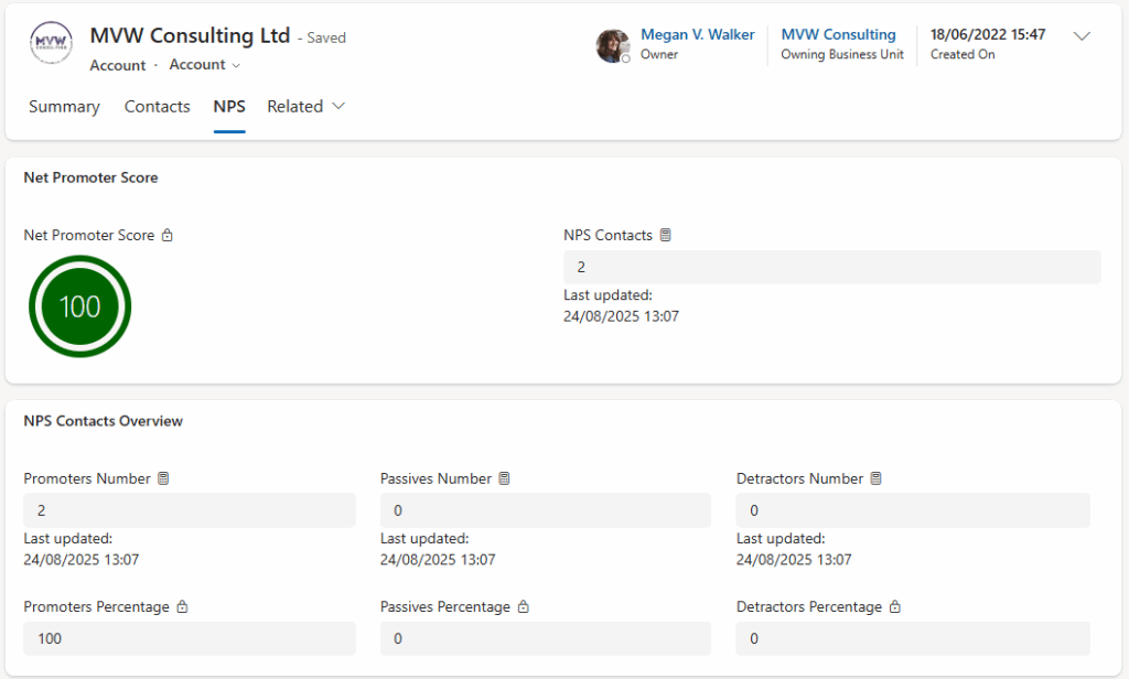 This is what it looks like on the Account. We can see 2 Contacts have provided feedback, both were Promoters so we have the highest possible NPS value for this company.