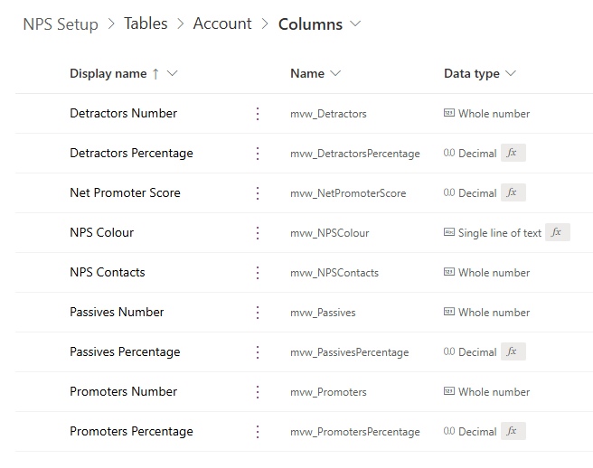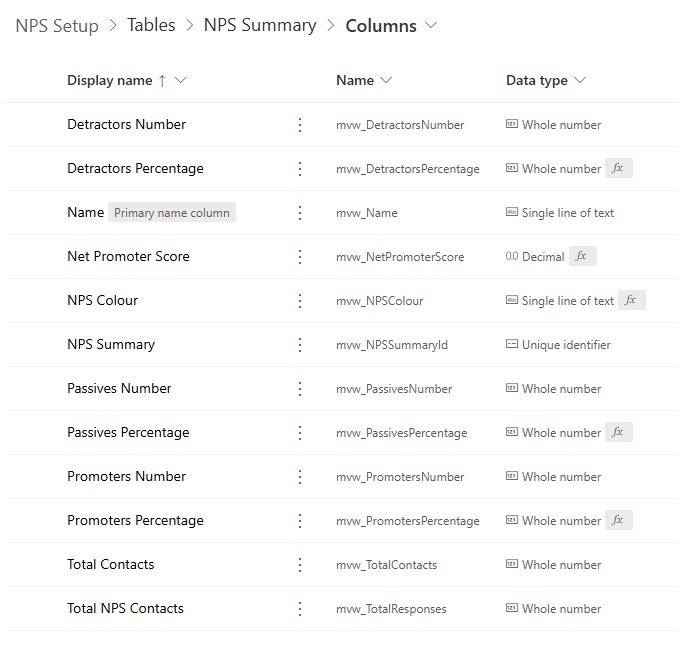 Last thing, we need to almost repeat what we did on the Account on to a new table. It used to be (back in 2019 at least!) that we could add all of this on to the Business Unit table and it worked beautifully. That is no longer available to us I guess based on security related changes over the years. So, now I have added in a new table called NPS Summary. In theory you could add in multiple records for this, or create yearly and so on, but in reality I just need to create one record for it. My NPS Summary custom table contains the following fields. Follow the logic above to create the Promoters Percentage, Passives Percentage, Detractors Percentage, NPS Colour and Net Promoter Score fields. All of the others (Promoters Number, Passives Number, Detractors Number, Total Contacts and Total NPS Contacts) we will set using Power Automate.