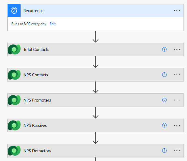 Your flow ideally will run on a regular basis, daily, weekly etc. We then need 5 different List Rows steps. Each one will go off and get the number of records for each part, so each will have slightly different filtering. Note that the total number of contacts isn’t needed for any calculations, I just thought it might be helpful to see how many out of your entire database exist vs having given NPS feedback. For each List rows step, you will use a different filter in the Fetch XML part, all provided below.