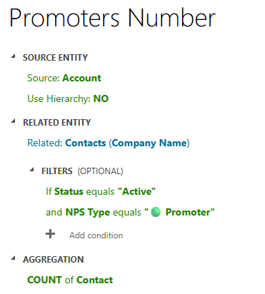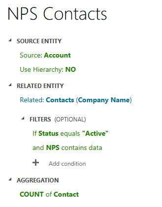 For the whole number fields, we still need to do rollups to count the number of Contacts that match some filtering. The NPS Contacts is all Contacts related to an Account via the Company Name link, then filtered to only count those that are Active and where the NPS field contains a value. Then our aggregation is the Count of all those Contacts.