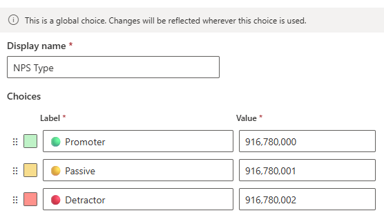 First off make sure you have a global choice field called NPS Type. The values should be Promoter, Passive and Detractor. You can add a little emoji to the label if you like, and also colour code each choice so that it shows up in views. All adds to the quick visual impact for users in a model-driven app.
