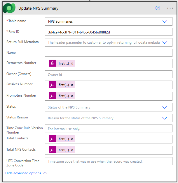 Then at the bottom add in an update a row step, and find your NPS Summaries table. I suggest you add a record first, then get the GUID (right at the end of the URL) and add it here. You could of course use an environment variable or other means to find the right record, but in my case it was easier to hard code. For each value we need to update, we have a different expression. Assuming you copied the naming convention I used for each List rows step and you copied the FetchXML queries I gave you, you should be able to copy and paste each expression in to the right spot.