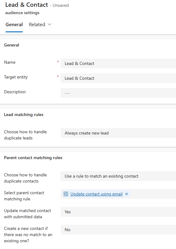 Click on your audience settings record to update more defaults. This is where you can determine what rules to use for Lead & Contact. Each time a form is filled out, in the example below, a new lead will always be created. Remember that these are going to be the defaults, you can always override these settings when you create your marketing forms. For the Parent contact matching rules, we can then determine what to do if the form is submitted by a Contact that already exists (using the parent contact matching rule). We can even determine if the contact should be updated with the submitted data, and if a new Contact should be created if there wasn’t an existing one found. This is perfect! This feels much more inline with a typical sales process and organisation that is only creating Contacts when a Lead gets qualified. So review the options and set them in a way that makes sense for your client or organisation.
