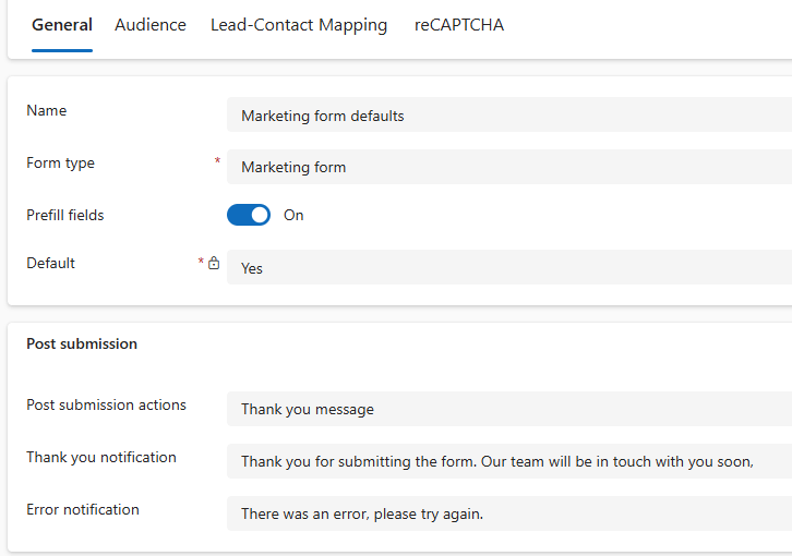 This post will focus on the one for Marketing forms. If it isn’t already marked as Yes for the Default, go ahead and do that. From the General screen you can determine if you want to use Prefill fields on your forms. You can also set a default action once a form is submitted (posted), along with a thank you message and notification message.