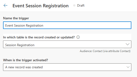 A Contact is linked to a Session Registration so select that as the table, and that it will trigger when a new record was created. Save the trigger and make it live.