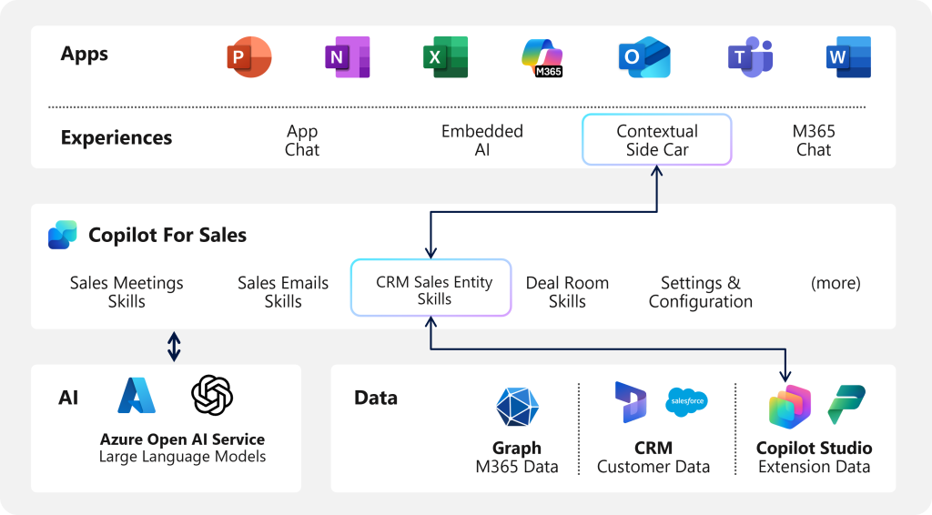 At the top, we have the Microsoft 365 applications where sellers work: PowerPoint, OneNote, Excel, Planner, Outlook, Teams, and Word. These apps host different Copilot for Sales experiences: