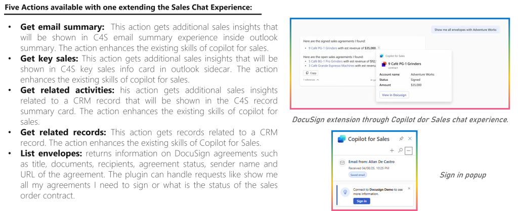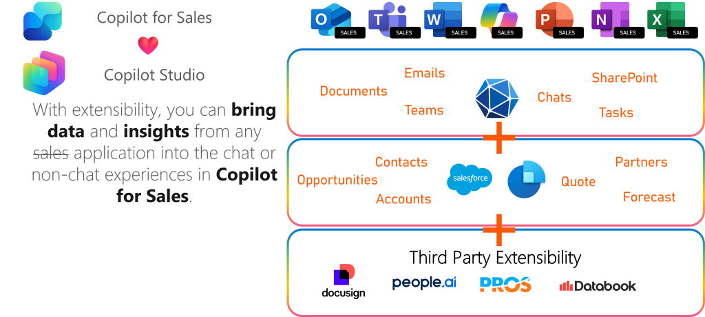 It means that custom extensions you build aren’t isolated—they become part of the broader Microsoft 365 Copilot intelligence (if you have both). When you extend Copilot for Sales with a connector to your ERP or data lake, that data can become available not just in the Copilot For Sales side pane, but also when Microsoft 365 Copilot is generating documents and using Copilot For Sales, preparing presentations, or drafting emails.