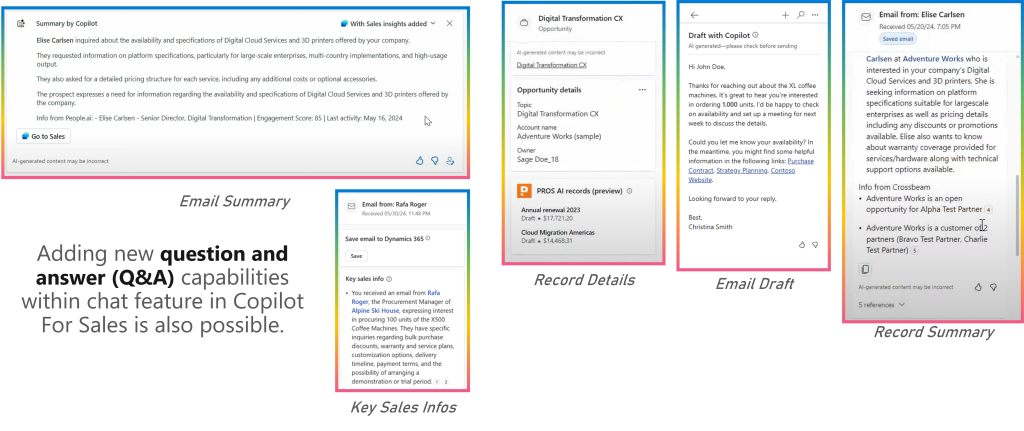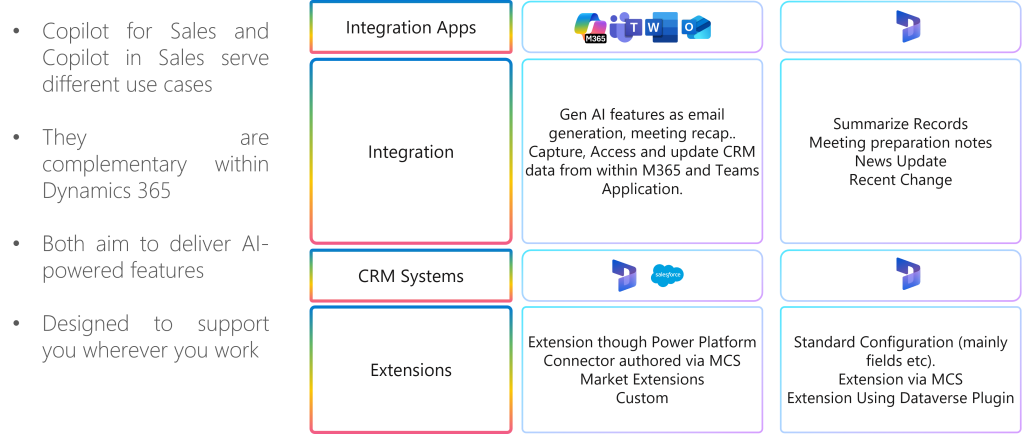 • Copilot FOR Sales is about bringing AI-powered sales capabilities to where sellers already work—their inbox, their meetings, their documents. It’s the bridge between Microsoft 365 and your CRM, ensuring that sales teams don’t need to constantly switch contexts or manually transfer information between systems.