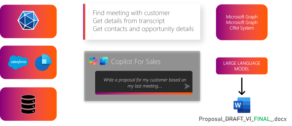 The power of Copilot comes from its ability to intelligently orchestrate data from multiple sources and present it in context. What makes this particularly powerful is the symbiotic relationship between Microsoft 365 Copilot and Copilot for Sales. When you ask Microsoft 365 Copilot a sales-related question—for example, “Create a proposal document for this customer highlighting our solutions that address their recent support issues”—here’s what happens: