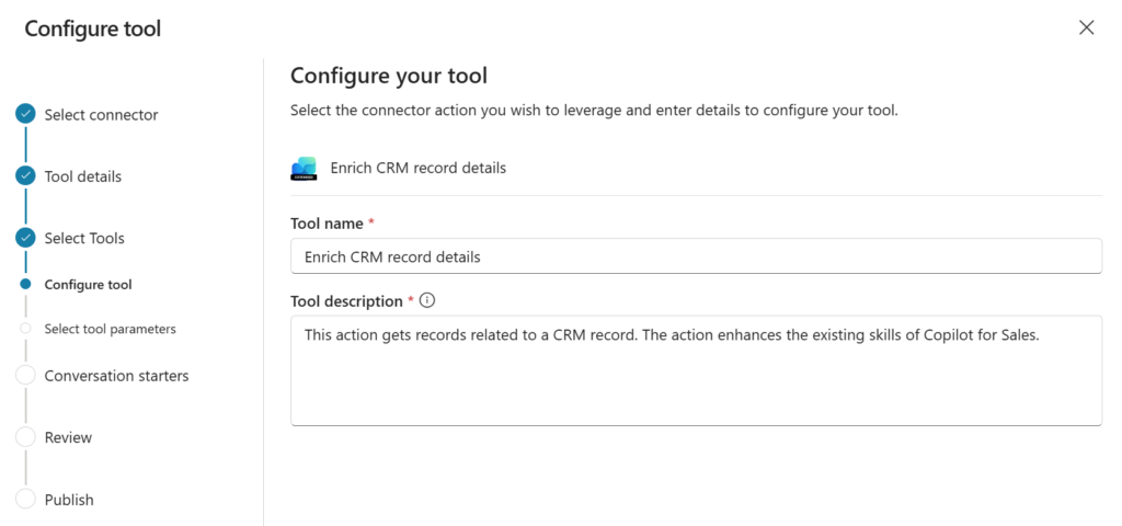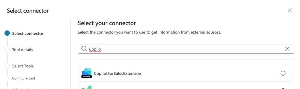 Within the Copilot for Sales agent, navigate to the section where you can add tools (connectors). Add your custom connector—the one we created in Step 2.