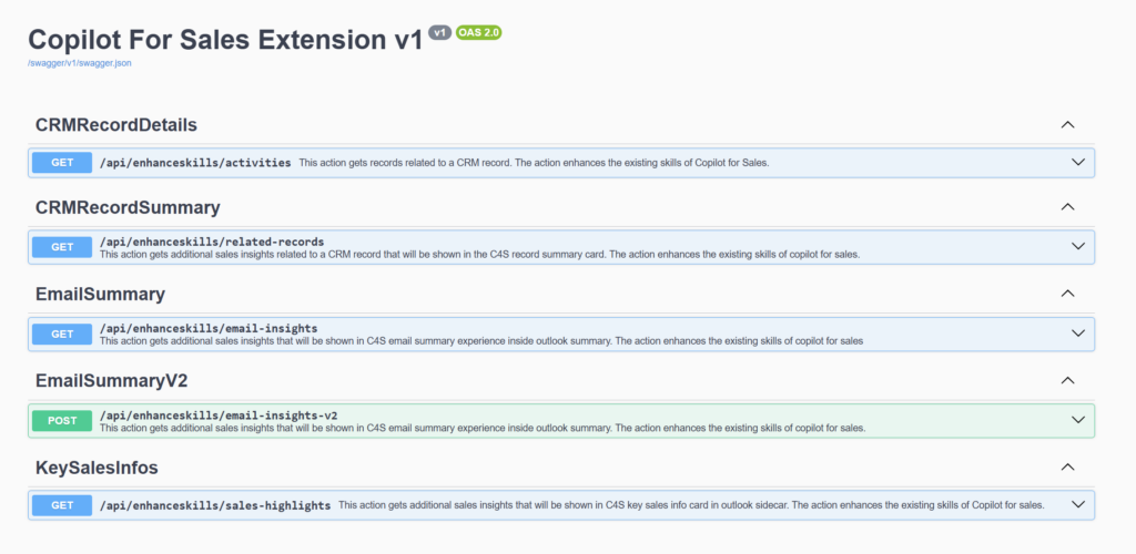 Your Swagger should include the extension points you’ve implemented. Each one has a specific operationId that Copilot for Sales recognizes: