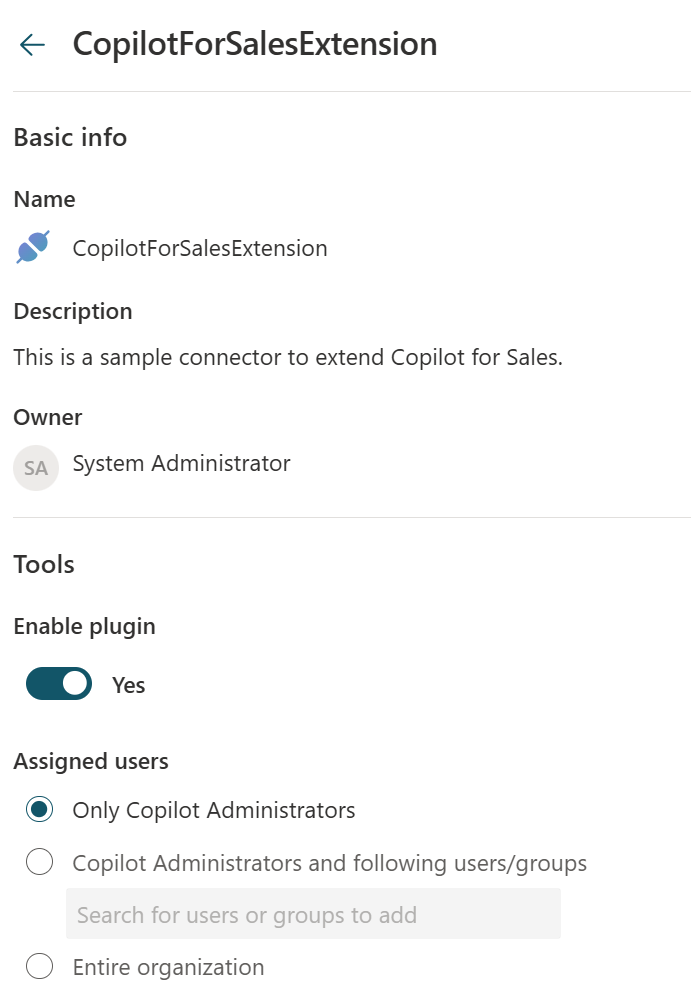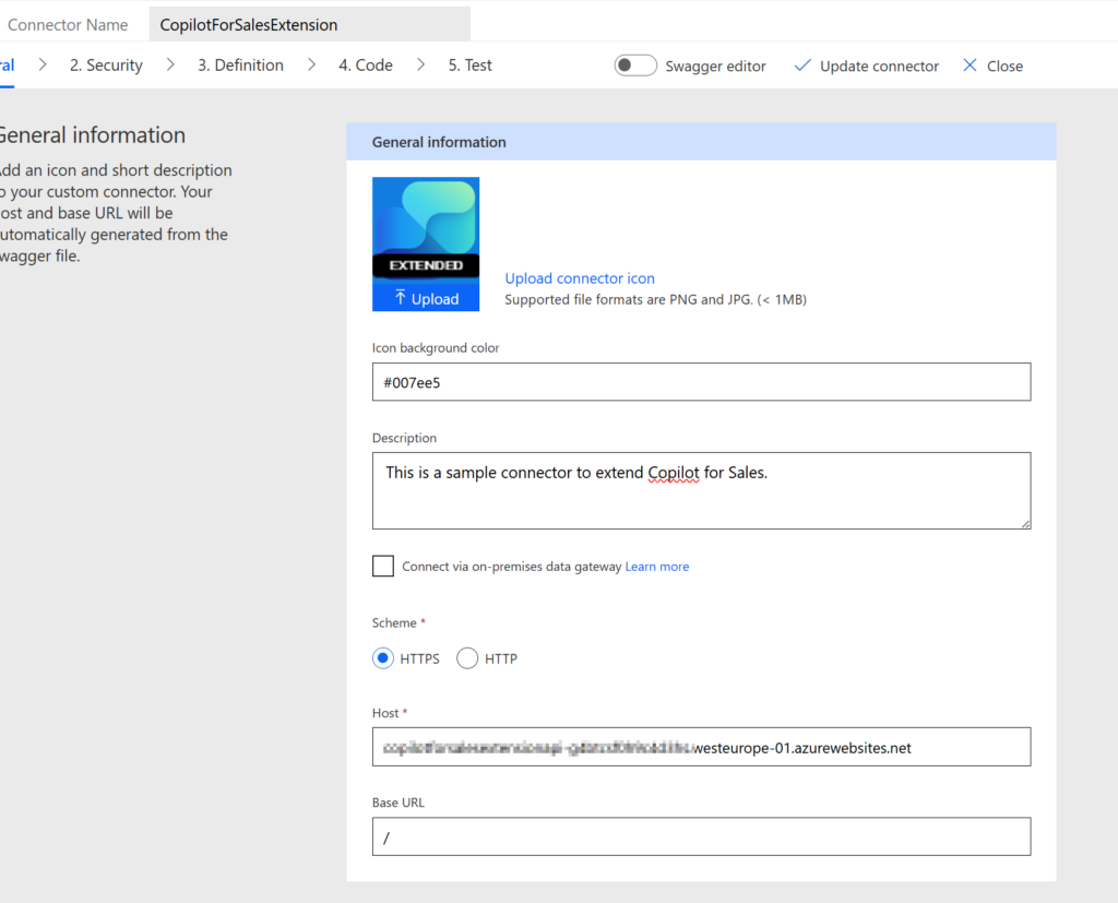 • Add a description (e.g., “This is a sample connector to extend Copilot for Sales.”)