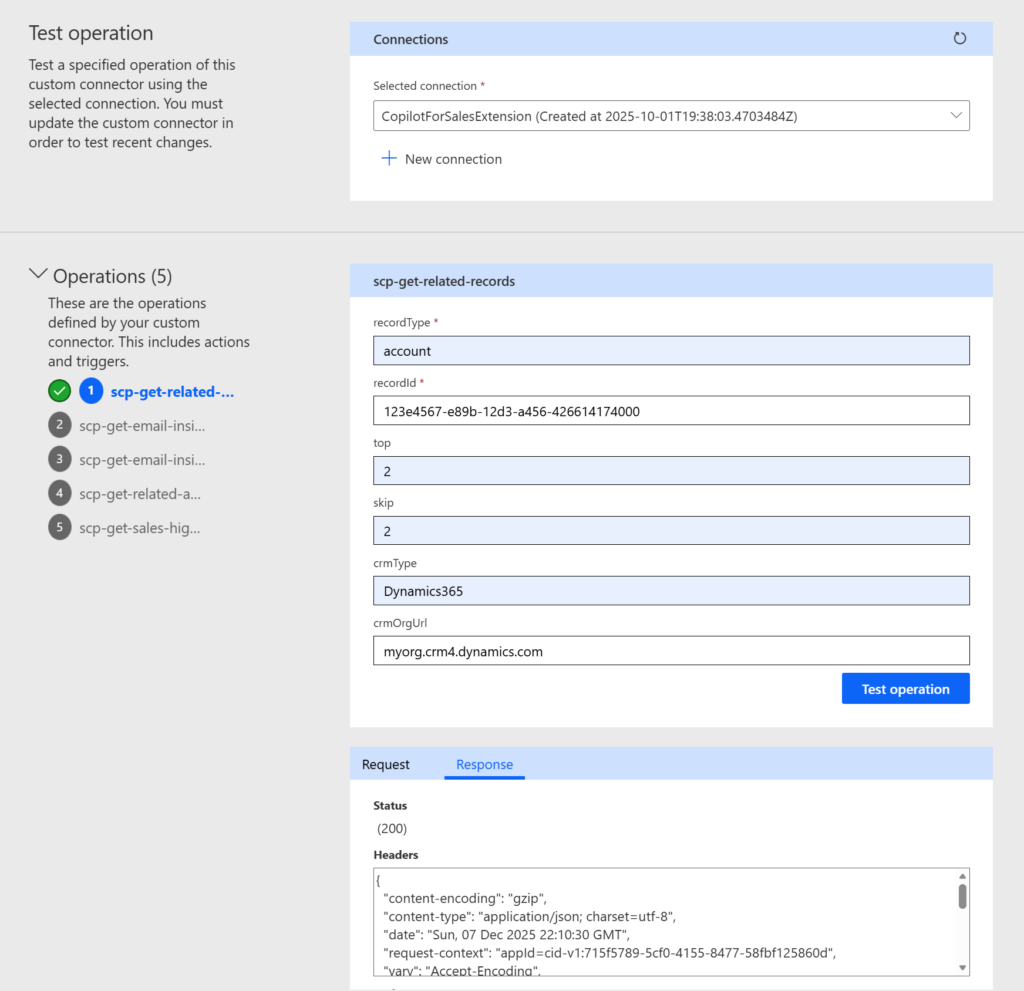 ⚠️ Important: The operationId values (prefixed with scp-) and the descriptions are what Copilot for Sales uses to understand your extensions. Don’t modify these unless you know exactly what you’re doing.
