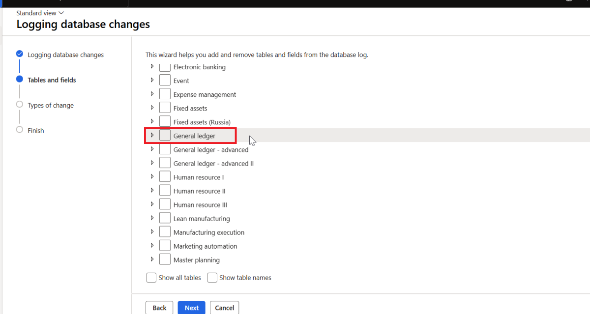 As mentioned earlier, locating the right table within the extensive range of sections can be quite challenging. For example, under the General Ledger section, there are multiple subsections, making it cumbersome to pinpoint the exact tables you need.