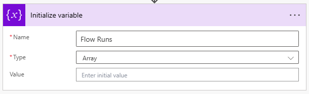 The first action will be to initialize a variable that needs to be an Array. This will be used throughout the flow to populate information about the flow runs that failed and put them in to a nice table for the email.
