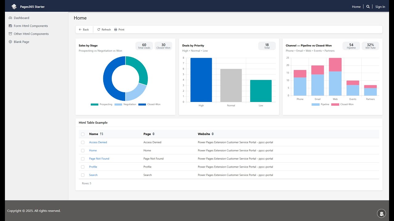 Pages365 Starter is a free, fluid-design template crafted to help Power Pages makers accelerate site buildout with modern components, minimal setup, and a Model-Driven App style experience. This starter kit