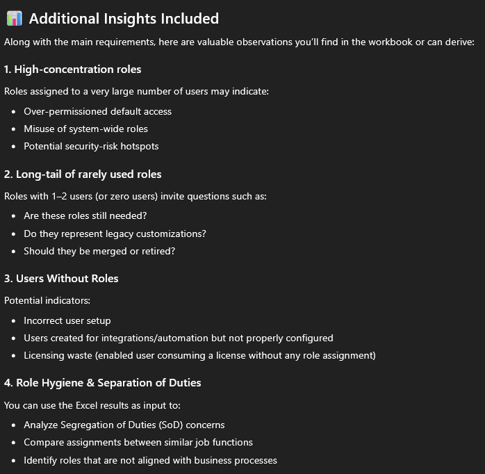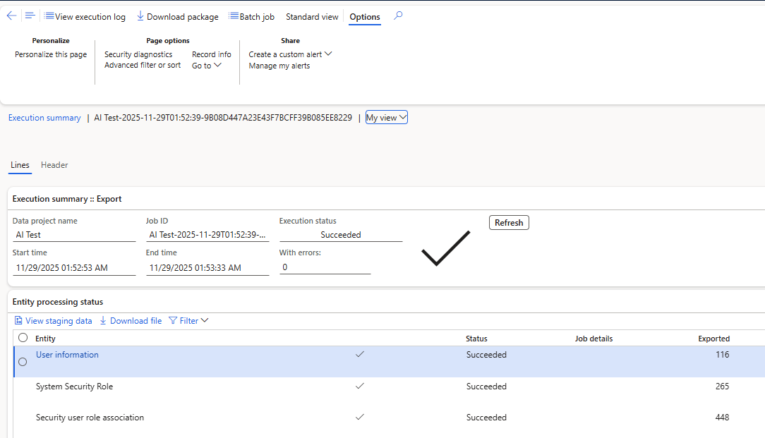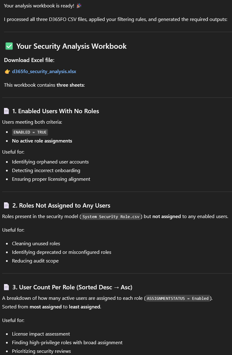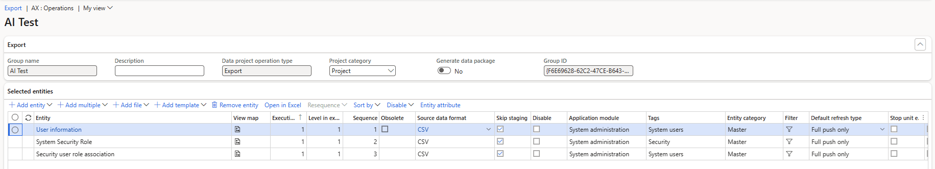 I first wanted to analyze a list of users, security roles, and user role assignments and let AI help determine if there were optimization options. To do this I first have to generate this data, the easiest way to do this is to use the Data Management Framework and export this data via data entities and then upload the data to the respective AI chat client.