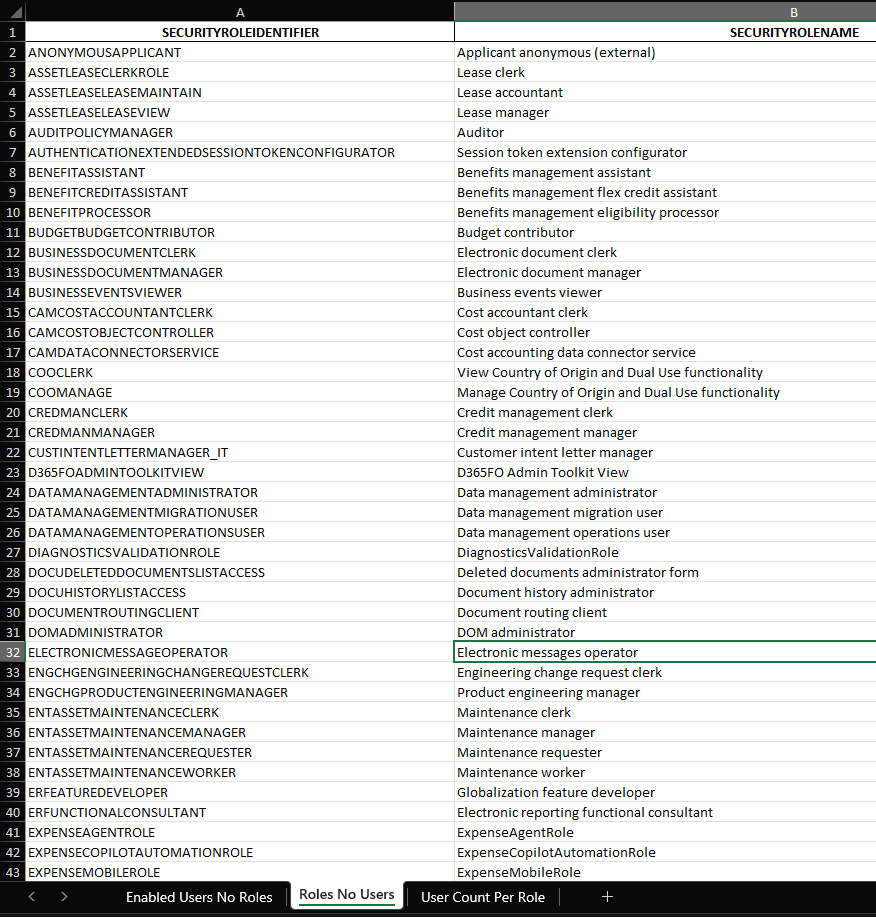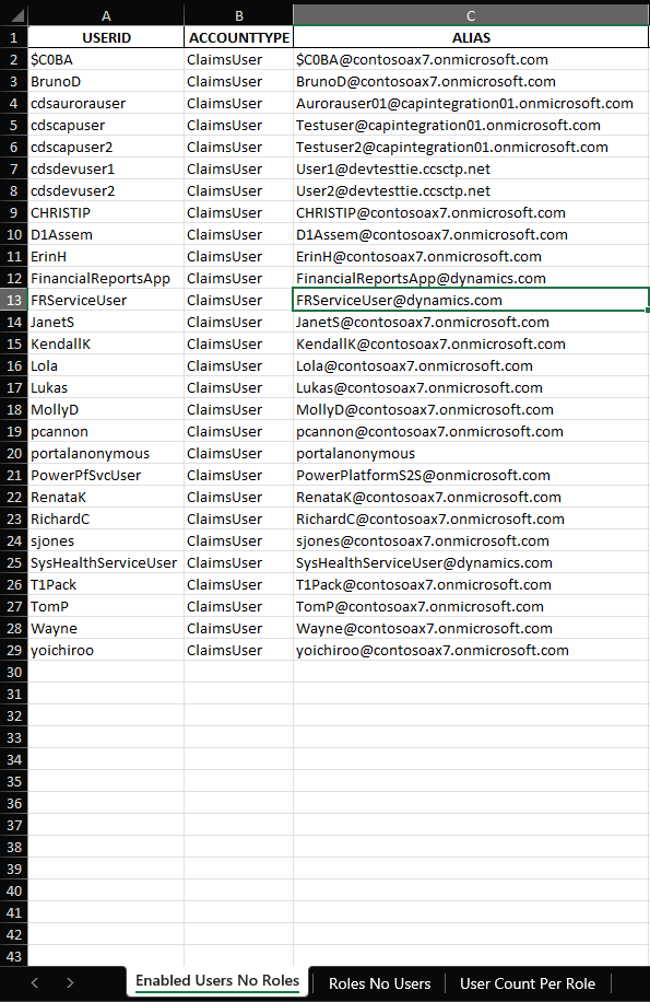 The generated Excel file includes 3 tabs, the first shows users that are not assigned any roles in my test environment: