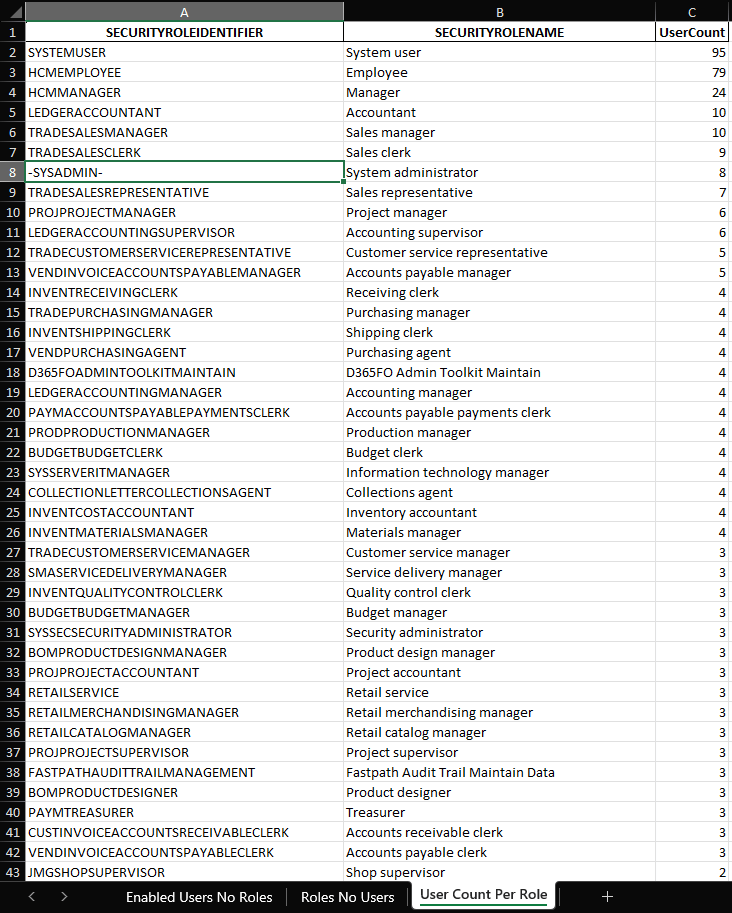 And the third includes a break down of the security roles and how many each user is assigned to: